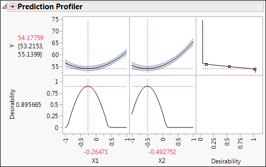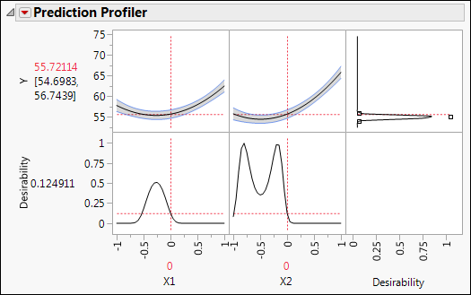 The Prediction Profiler report shows the quadratic behavior of the response surface along traces for X1 and X2. Because the Response Limits column property is set for Y, the profiler also shows desirability functions.