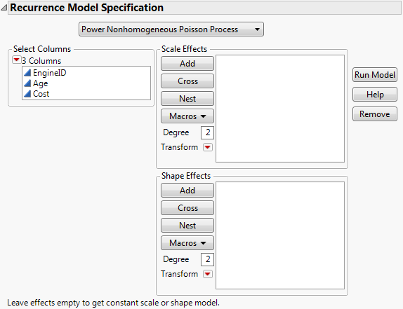 For the Recurrence Model Specification window (Recurrence Model Specification), if you include Scale Effects or Shape Effects, the scale and shape parameters in Scale and Shape Parameters are modeled as functions of the effects. To fit the models with constant scale and shape parameters, do not include any Scale Effects or Shape Effects.