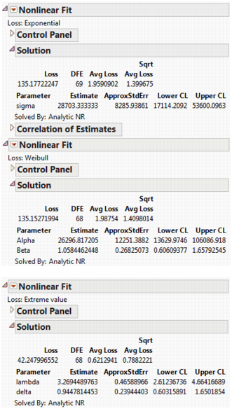 Tip: To view the formulas for the loss functions, in the Fan.jmp data table, right-click the Exponential, Weibull, and Extreme value columns and select Formula.