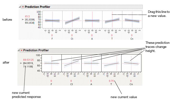 If you change the value of a factor, the prediction trace for that factor is not affected, but the prediction traces of all the other factors can change. The Y response line must cross the intersection points of the prediction traces with their current value lines.