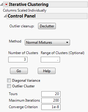 The Control Panel for the Cytometry.jmp data table, with the variables CD3 through MCB as Y, Columns, is shown in Control Panel for Normal Mixtures Method. You can fit various numbers of clusters using the Control Panel iteratively or you can specify a range using the Range of Clusters option.