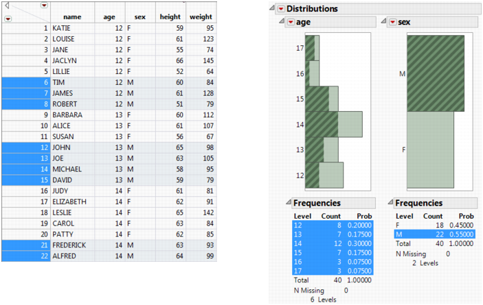 Most JMP platforms present the results of your analyses in a report window. The report window consists of graphs and statistical reports that are often linked to the data table. When you select data in the graph or report, the data is highlighted in the data table. Example of a JMP Report Window and Data Table shows an example of selected data in a report window and in a data table.