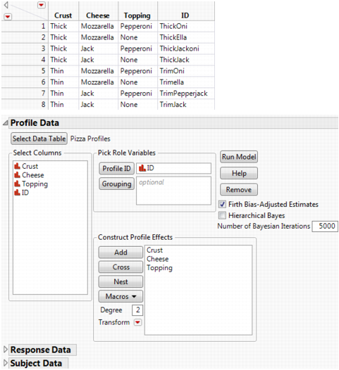 The profile data table describes the attributes associated with each choice. Each attribute defines a column in the data table. There is a row for each profile. A column in the table contains a unique identifier for each profile. Profile Data Table and Completed Profile Data Outline shows the Pizza Profiles.jmp data table and a completed Profile Data panel.