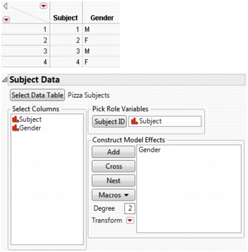 The subject data table is optional and depends on whether you want to model subject effects. The table contains a column with the subject identifier used in the response table, and columns for attributes or characteristics of the subjects. You can put subject data in the response data table, but you should specify the subject effects in the Subject Data outline. Subject Data Table and Completed Subject Data Outline shows the Pizza Subjects.jmp data table and a completed Subject Data panel.