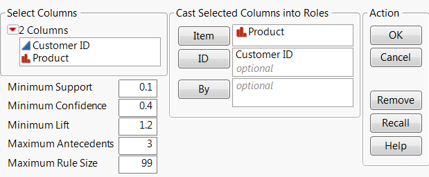 You can use the minimum support, maximum antecedent, and maximum rule size options in the launch window to reduce computational time for large data sets. For more information about these measures, see