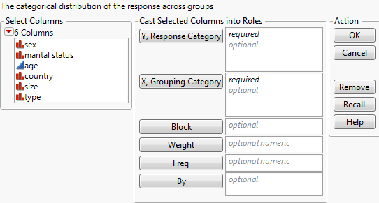 To launch the Fit Y by X platform, select Analyze > Fit Y by X.
