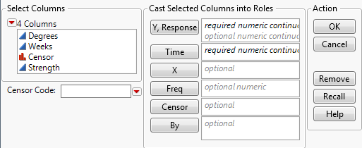 Launch the Destructive Degradation platform by selecting Analyze > Reliability and Survival > Destructive Degradation. Destructive Degradation Launch Window shows the Destructive Degradation launch window using the Adhesive Bond.jmp data table (located in the Reliability folder).