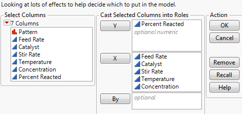 Open the data table called Plackett-Burman.jmp, found in Design Experiment folder in the Sample Data installed with JMP. This table contains the design runs and the Percent Reacted experimental results for the 12-run Plackett-Burman design created in the previous section.