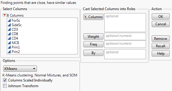 Launch the K Means Cluster platform by selecting Analyze > Clustering > K Means Cluster. K Means Cluster Launch Window shows the Clustering launch window for Cytometry.jmp.