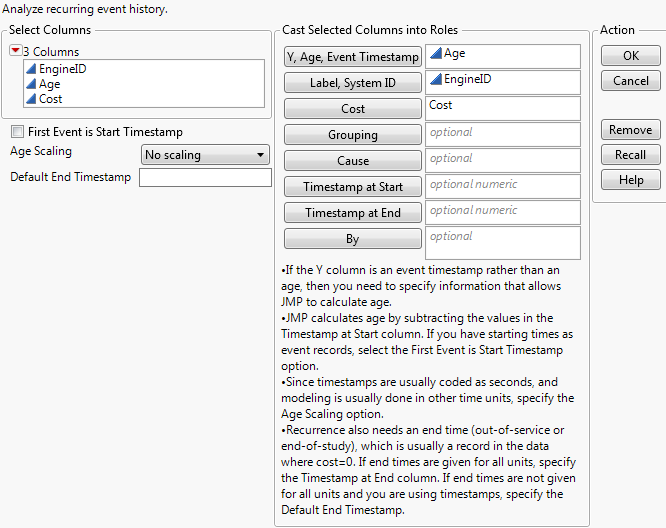 Specifies the column with the end-of-service timestamp. If end times are given for all units, specify that column here. If end times are not given for all units, specify the Default End Timestamp option instead. But if you have a record in which Cost is equal to zero, JMP uses that record as the end timestamp and you do not need to specify this role.