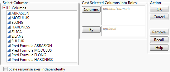 To launch the Surface Plot Profiler platform directly, select Surface Plot from the Graph menu. If there is a data table open, this displays the window in Surface Plot Launch Window. If you do not want to use a data table for drawing surface plots, click OK without specifying any columns. If there is no data table open, you are presented with the default surface plot shown in Default Surface Plot with Formula.