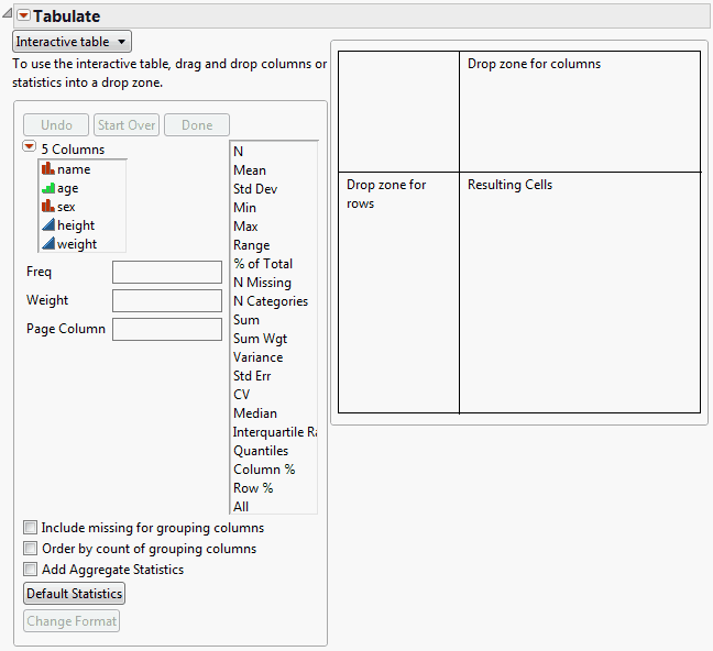 To launch the Tabulate platform, select Analyze > Tabulate.