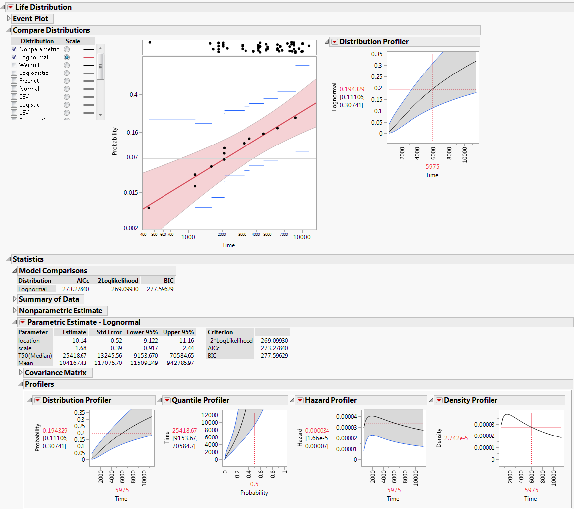 If you have not selected a Failure Cause in the launch window, you will see the Life Distribution report. Use this report to analyze lifetime data where some time observations might be censored. The Life Distribution report contains the following content and options:
