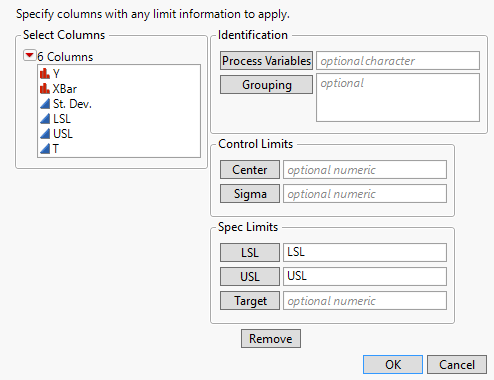 If you have control limits but do not have columns for Center or Sigma, then you can construct Center and Sigma columns in the Limits Table using formulas. For example: