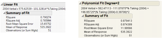 The RSquare values in Summary of Fit Reports for Linear and Polynomial Fits indicate that the polynomial fit of degree 2 gives a small improvement over the linear fit. See Summary of Fit Report.