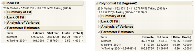 The Analysis of Variance reports in Examples of Analysis of Variance Reports for Linear and Polynomial Fits compare a linear fit (Fit Line) and a second degree (Fit Polynomial). Both fits are statistically better from a horizontal line at the mean.