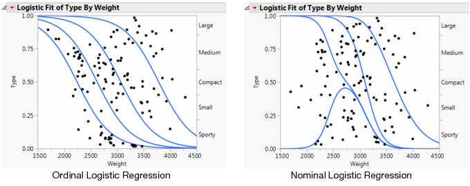 The Logistic platform fits the probabilities for response categories to a continuous x predictor. The fitted model estimates probabilities for each x value. The Logistic platform is the nominal or ordinal by continuous personality of the Fit Y by X platform. There is a distinction between nominal and ordinal responses on this platform: