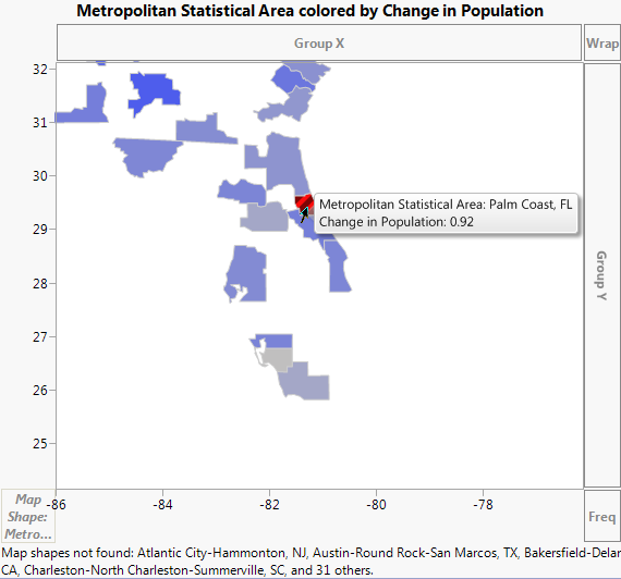 Once the Map Role column property has been set up, you can perform your analysis. You want to visually see how the population has changed in the metropolitan statistical areas of the United States between the years 2000 and 2010.