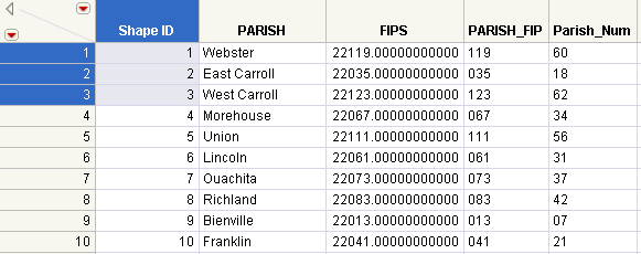 Suppose that you have downloaded Esri shapefiles from the Internet and you want to use them as your map files in JMP. The shapefiles are named Parishes.shp and Parishes.dbf. These files contain coordinates and information about the parishes (or counties) of Louisiana.