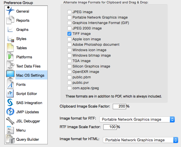 Select one or more graphic formats to use when copying and pasting (or dragging and dropping) graphics from JMP into other applications.