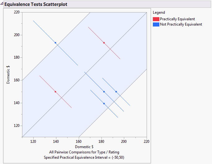 confidence interval for a pairwise comparison. The coordinates of the point on the line segment are the means for the corresponding groups. Placing your cursor over one of these points displays a tooltip indicating the groups being compared and the estimated difference. When a line segment is entirely contained within the diagonal band, it follows that the means are practically equivalent.