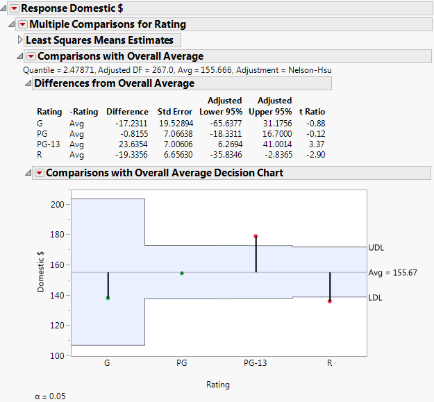 The results shown in Comparisons with Overall Average for Ratings indicate that the least squares means for movies with a Rating of PG-13 and R differ significantly from the overall average in terms of Domestic $.