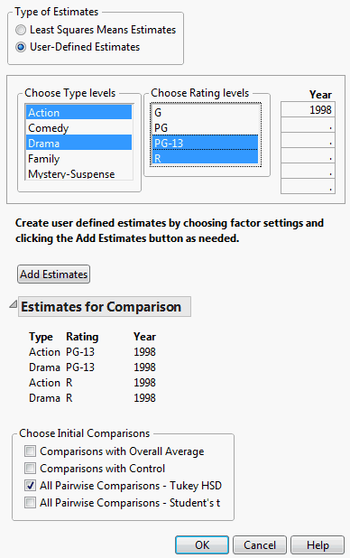 Consider the Movies.jmp sample data table. You are interested in Domestic $ differences for action and drama movies across two Rating categories, PG-13 and R, in the year 1998.