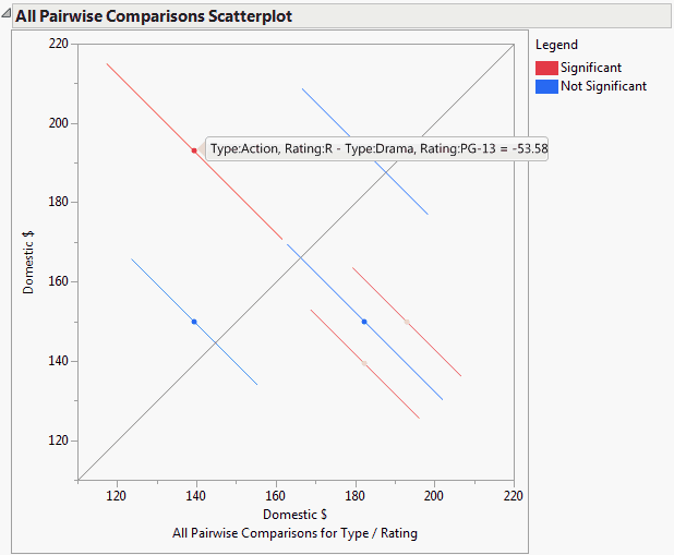 The All Pairwise Differences report indicates that three of the six pairwise comparisons are significant. The All Pairwise Comparisons Scatterplot, shown in All Pairwise Comparisons Scatterplot for User-Defined Comparisons, shows the confidence intervals for these comparisons in red. Also shown is the tooltip for one of these intervals, indicating that the interval compares Action, Rating R movies to Drama, Rating PG-13 movies, and that the mean difference in Domestic $ is -53.58.