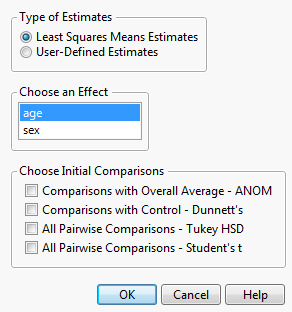 An example of the control window for the Multiple Comparisons option is shown in Launch Window for Least Squares Means Estimates. This example is based on the Big Class.jmp data table, with weight as Y and age, sex, and height as model effects. Two classes of estimates are available for comparisons: Least Squares Means Estimates and User-Defined Estimates.