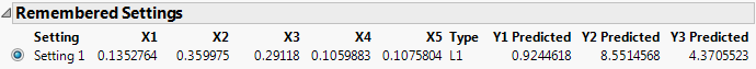 This example uses the Five Factor Mixture.jmp sample data table. There are five components (x1 to x5), one categorical process factor (Type), and three responses, Y1, Y2, and Y3. A response surface model is fit to each response and the prediction equations are saved in Y1 Predicted, Y2 Predicted, and Y3 Predicted.