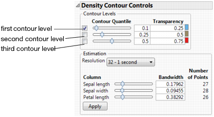 Type a new bandwidth for each variable, or click and drag the sliders. Click Apply to display your changes.
