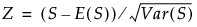 Note: The Wilcoxon test adds a continuity correction. If (S - E(S)) is greater than zero, then 0.5 is subtracted from the numerator. If (S - E(S)) is less than zero, then 0.5 is added to the numerator.