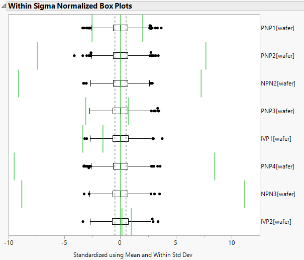 The Within Sigma Normalized Box Plots and Overall Sigma Normalized Box Plots options show or hide box plots that have been normalized using the within sigma and overall sigma, respectively. When drawing normalized box plots, JMP standardizes each column by subtracting the mean and dividing by the standard deviation. The box plots are formed for each column using these standardized values.