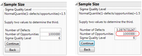 The computation shows that the Number of Defects cannot be more than approximately 3.4. (See right window in Sigma Quality Level Example 2.)