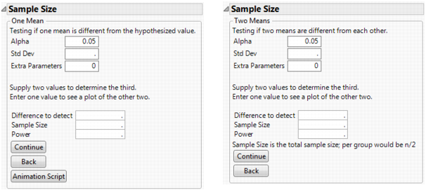 runs a JSL script that displays an interactive plot showing power or sample size. See the section, Sample Size and Power Animation for One Mean, for an illustration of the animation script.