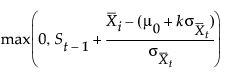 t = 1, 2,..., n, where S0 = 0, zt is defined as for two-sided charts, and the parameter k, termed the reference value, is positive. If the parameter k is not specified in the launch window, k is set to δ/2. The CUSUM St is referred to as an upper cumulative sum. St can be computed as follows: