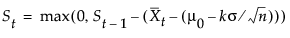 t = 1, 2,..., n, where S0 = 0, zt is defined as for two-sided charts, and the parameter k, termed the reference value, is positive. If the parameter k is not specified in the launch window, k is set to δ/2. The CUSUM St is referred to as a lower cumulative sum. St can be computed as follows:
