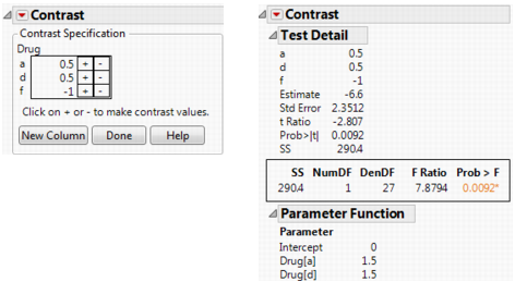 The Contrast report shows that the LSMean for drug f is significantly different from the average of the LSMeans of the other two drugs.