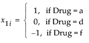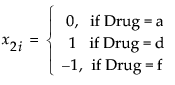 , is defined as follows. Note that Drug=a contributes a value 1, Drug=d contributes a value 0, and Drug=f contributes a value –1 to the indicator variable: