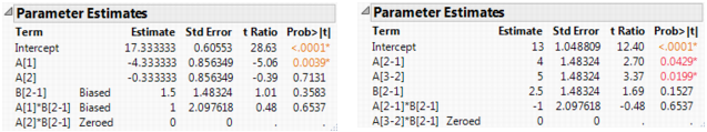 The example is the same as above, with two observations per cell except that the A3B2 cell has no data. You can now compare the results when the factors are coded nominally with results when they are coded ordinally. The model fit is the same, as seen in Summary Information for Nominal Fits (Left) and Ordinal Fits (Right).