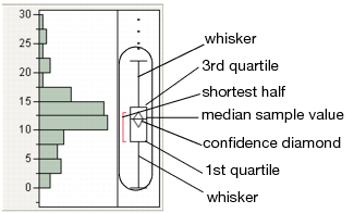 The bracket outside of the box identifies the shortest half, which is the most dense 50% of the observations (Rousseuw and Leroy 1987).
