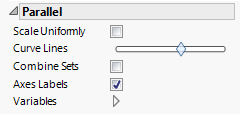 By default, the scales for the values of the variables are adjusted so that the minimum and maximum values are plotted at the same level. For example, in Parallel Plot for Pollution Data in Cities.jmp, the values of each of the variables have an identical vertical spread. Each vertical line is labeled by the minimum and maximum values of the variables.