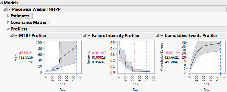 Three profilers are displayed, showing estimated MTBF, Failure Intensity, and Cumulative Events. These profilers do not use logarithmic scaling. For more detail on interpreting and using these profilers, see the section Show Profilers.
