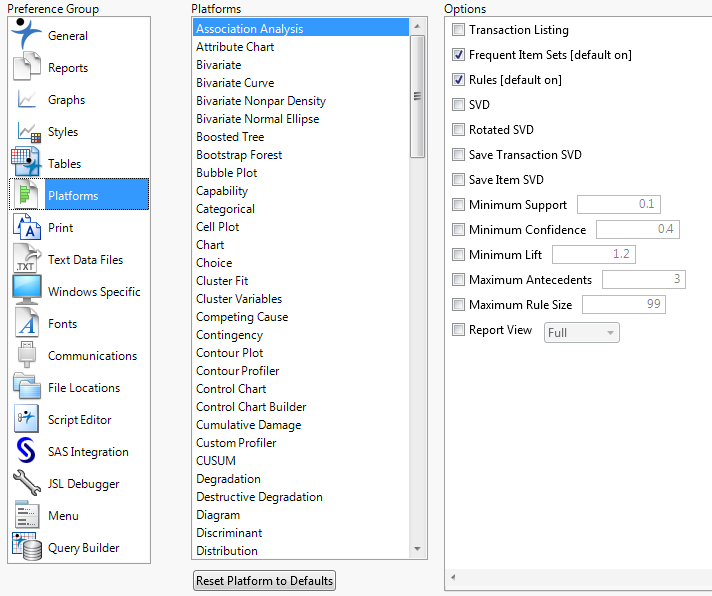 Each analysis report has a variety of plot and table options that are shown by default. However, there might be additional options that you want to see each time you run a particular analysis. For example, a bivariate analysis shows a scatterplot by default, but you might also always want to see a linear fit each time. By selecting the Platforms option in the left panel of the Preferences window, you can set the default options for analyses. (Analyses are run by using platforms, such as the Bivariate platform. Thus, the name of this category is Platforms.)