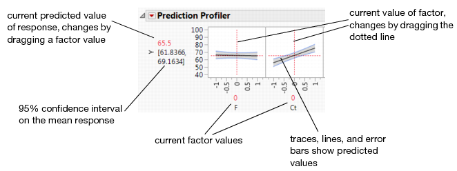 The Profiler displays profile traces (see Illustration of Traces) for each X variable. A profile trace is the predicted response as one variable is changed while the others are held constant at the current values. The Profiler recomputes the profiles and predicted responses (in real time) as you vary the value of an X variable.