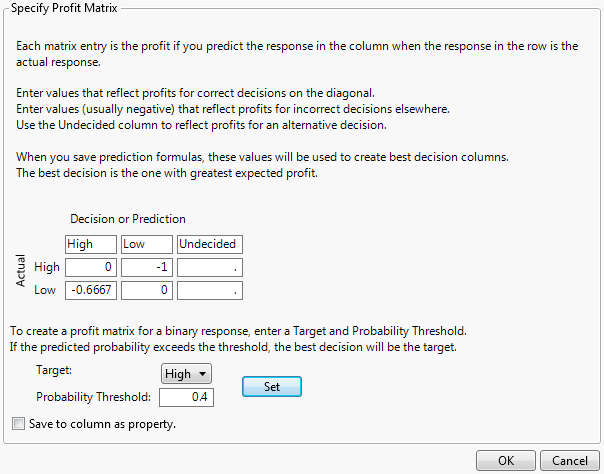 Denote the threshold probability by t. When you click Set, the entries in the profit matrix are assigned as follows: