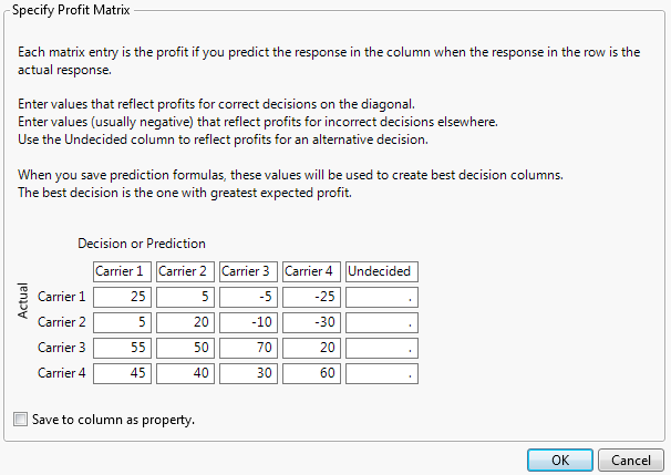 See Example of a Profit Matrix for More Than Two Levels. For an example of using a profit matrix in modeling, see Decision Matrix Report in the Predictive and Specialized Modeling book.