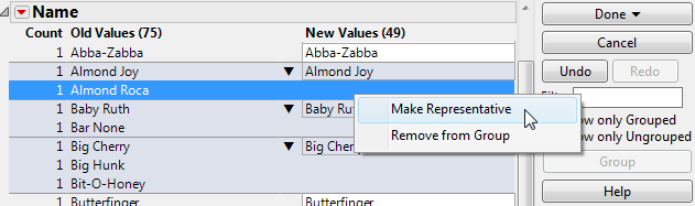 right-click selected values to select a different grouping value, or group representative. The Group To command displays the Old Values that occur most often in the data table with their corresponding New Values (if they are different). The list displays the first 8 possible group representatives.