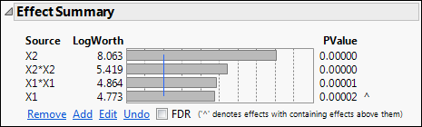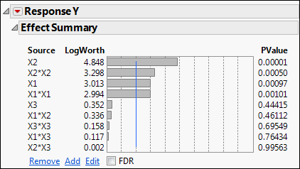 The Effect Summary report suggests that a number of effects are not significant. In particular, X2*X3 is the least significant effect with a PValue of 0.99563. Next, you will systematically reduce the model using the Effect Summary report interactively.