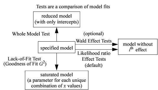 All of the statistical tests in the Logistic Regression reports compare the fit of the specified model with subset or superset models, as illustrated in Relationship of Statistical Tests. If a test shows significance, then the higher order model is justified.